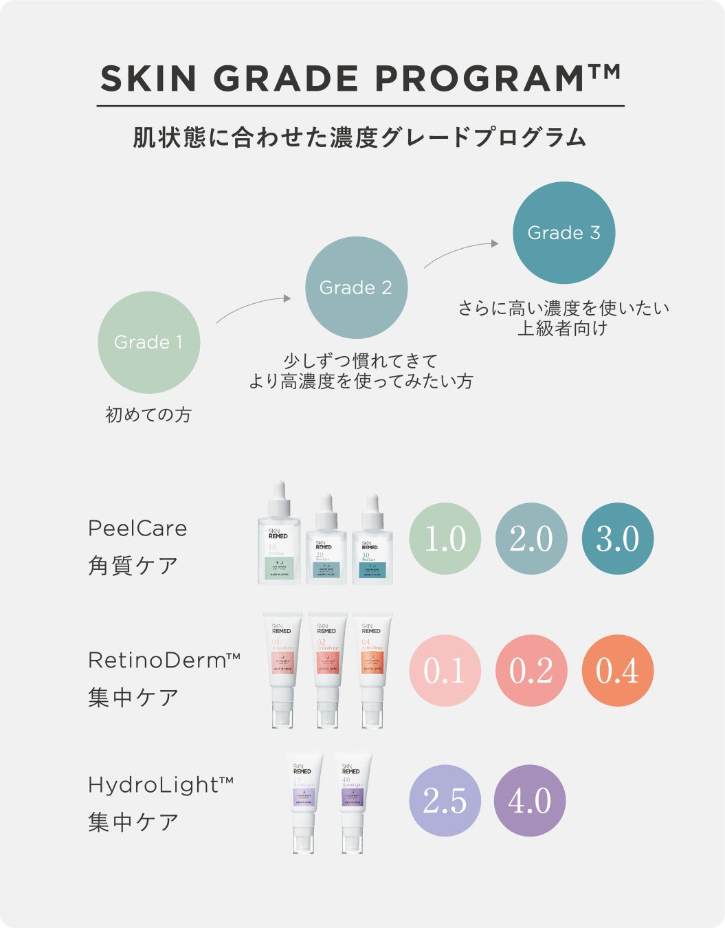 高濃度成分のケアでは初めての方が使うとA反応や肌荒れを起こしてしまうこともありますが、段階的にグレードを上げることで、肌に無理なく効果的なケアが可能です。
