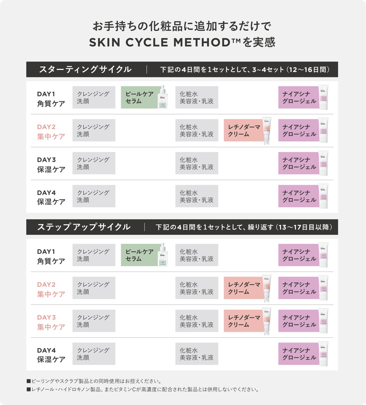 肌荒れを起こしにくく、より効果的にレチノール*1を使う方法として、アメリカ出身の皮膚科学の専門家が開発し、世界的に流行しているスキンケア方法を、日本人の肌に合うように独自にアレンジしたのが、SKN REMEDの“SKIN CYCLE METHOD™”です。