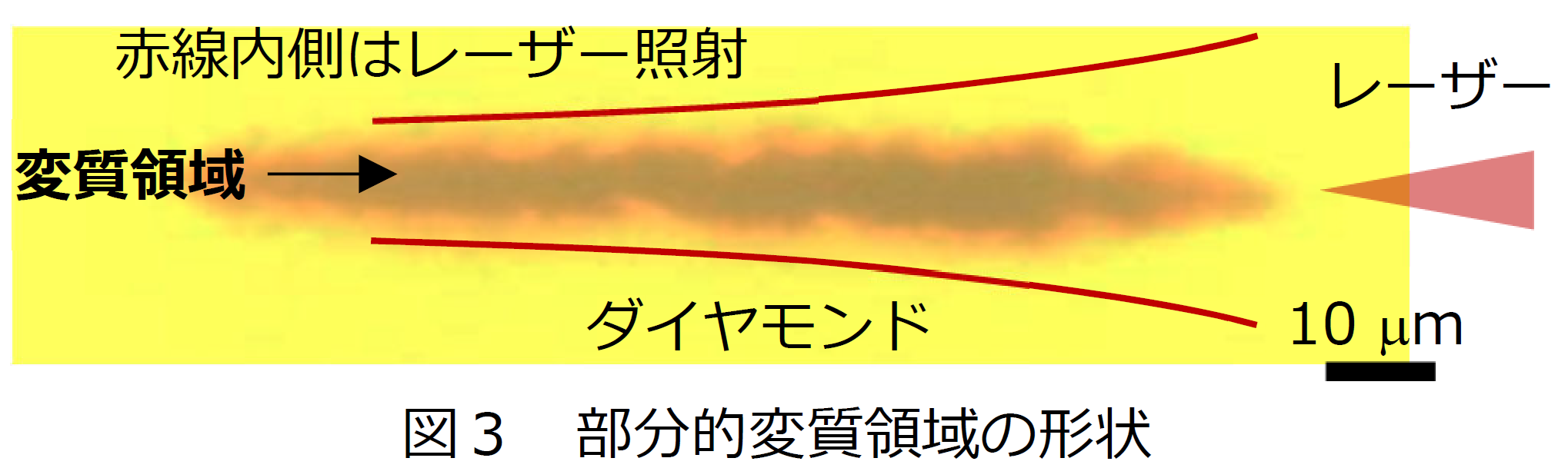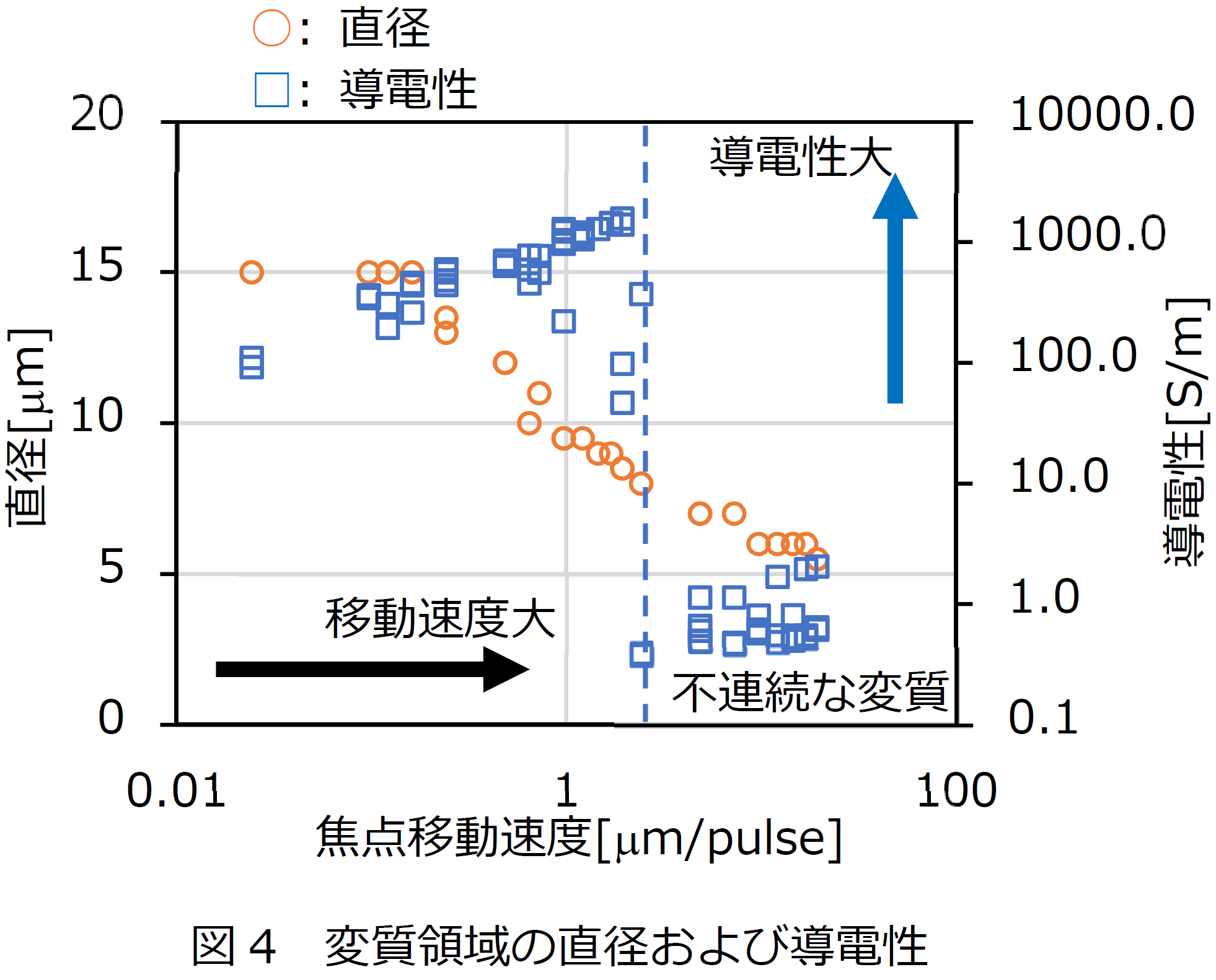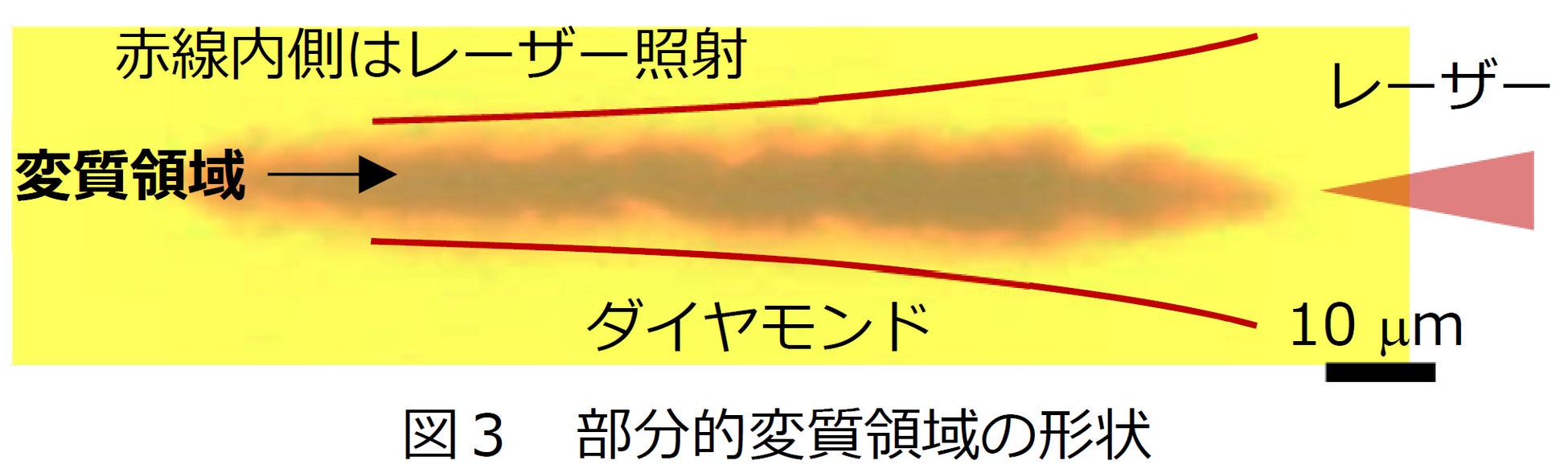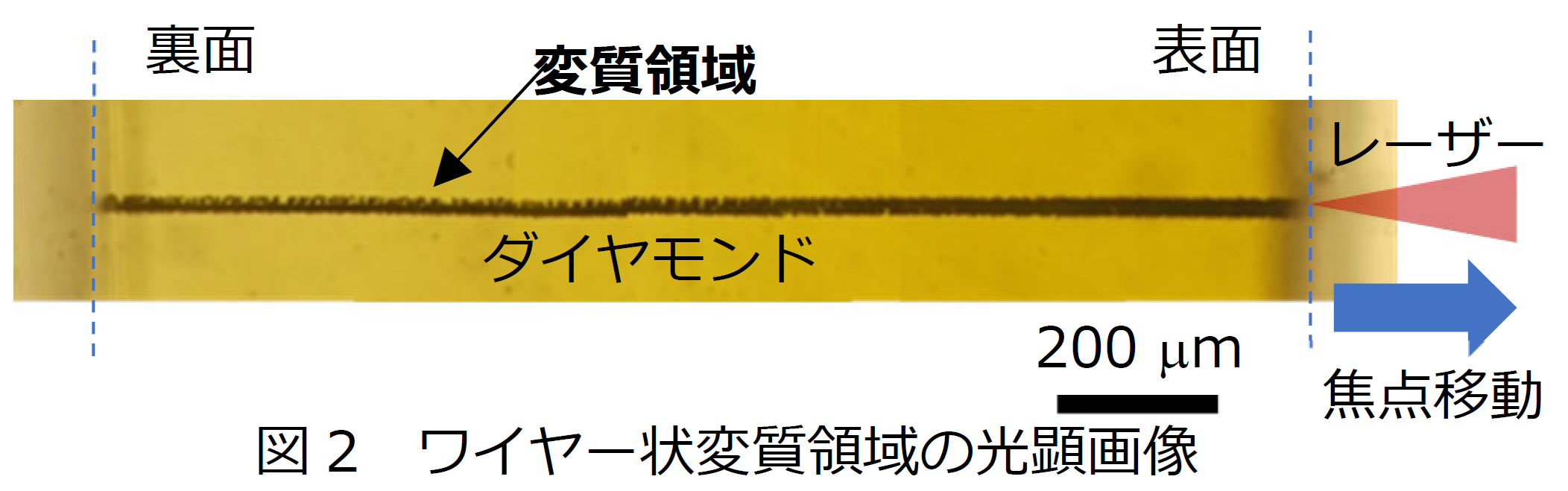 また、図4の青点線より焦点移動速度が速い場合は、変質領域がワイヤー状につながらず不連続になるため、導電性が著しく減少することも明らかにしました。