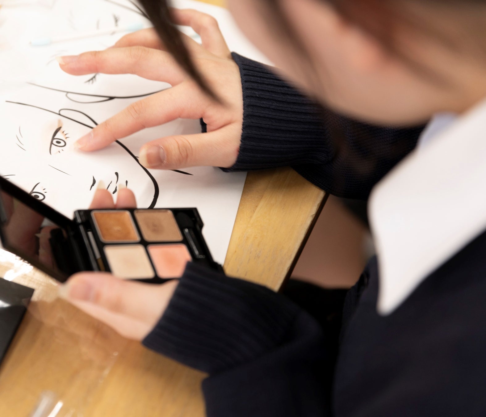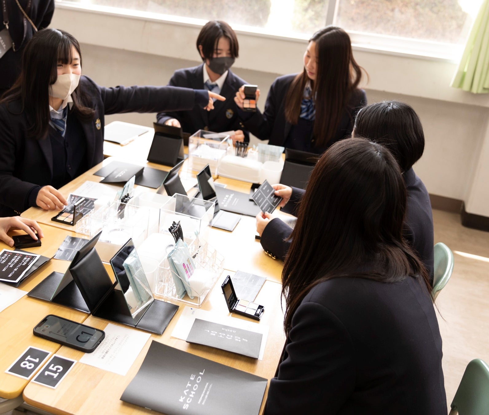 事前に選んだ欲名でつくられたアイシャドウパレットを一人ひとりに配布し、初めて見る特別なアイシャドウパレットを使って授業を展開しました。授業の中では、メイクの仕方を学ぶことに力点を置くのではなく、「なぜ100以上ある欲名の中から、それを選んだのか」など自身の考えを探求し、2人1組でディスカッションすることで自分らしさとは何かを深堀りしてもらいました。さらに、自身が選んだアイシャドウパレットを使い自由にメイクをすることで、新たな自分の一面に気づき、自分らしさを表現するという体験をしてもらいました。