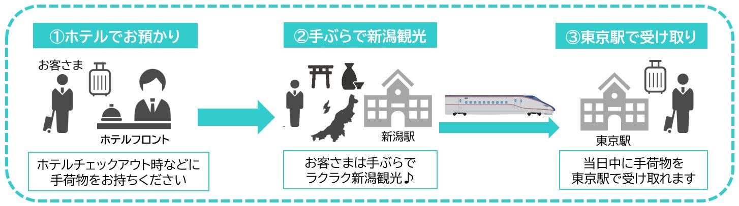 〇JR東日本グループは、身軽な列車旅を実現するべく「JRE手ぶら旅」サービスを実施しています。 〇8月7日(月)より、新潟エリアの手ぶら旅の提供に向け、列車荷物輸送サービス「はこビュン」を活用した新たな配送サービスを開始いたします。JR東日本ホテルメッツ新潟(以下、「ホテルメッツ新潟」)にご宿泊いただき、新潟駅から新幹線などをご利用のお客さまを対象に、チェックアウト時などお預かりした手荷物を、当日中に東京駅の指定手荷物預かり所でお渡しいたします。 〇今後も対象ホテルの拡大に加え、東京方面から各地域への手荷物配送など、お客さまの移動とくらしを豊かにする新たなサービスに挑戦します。 |