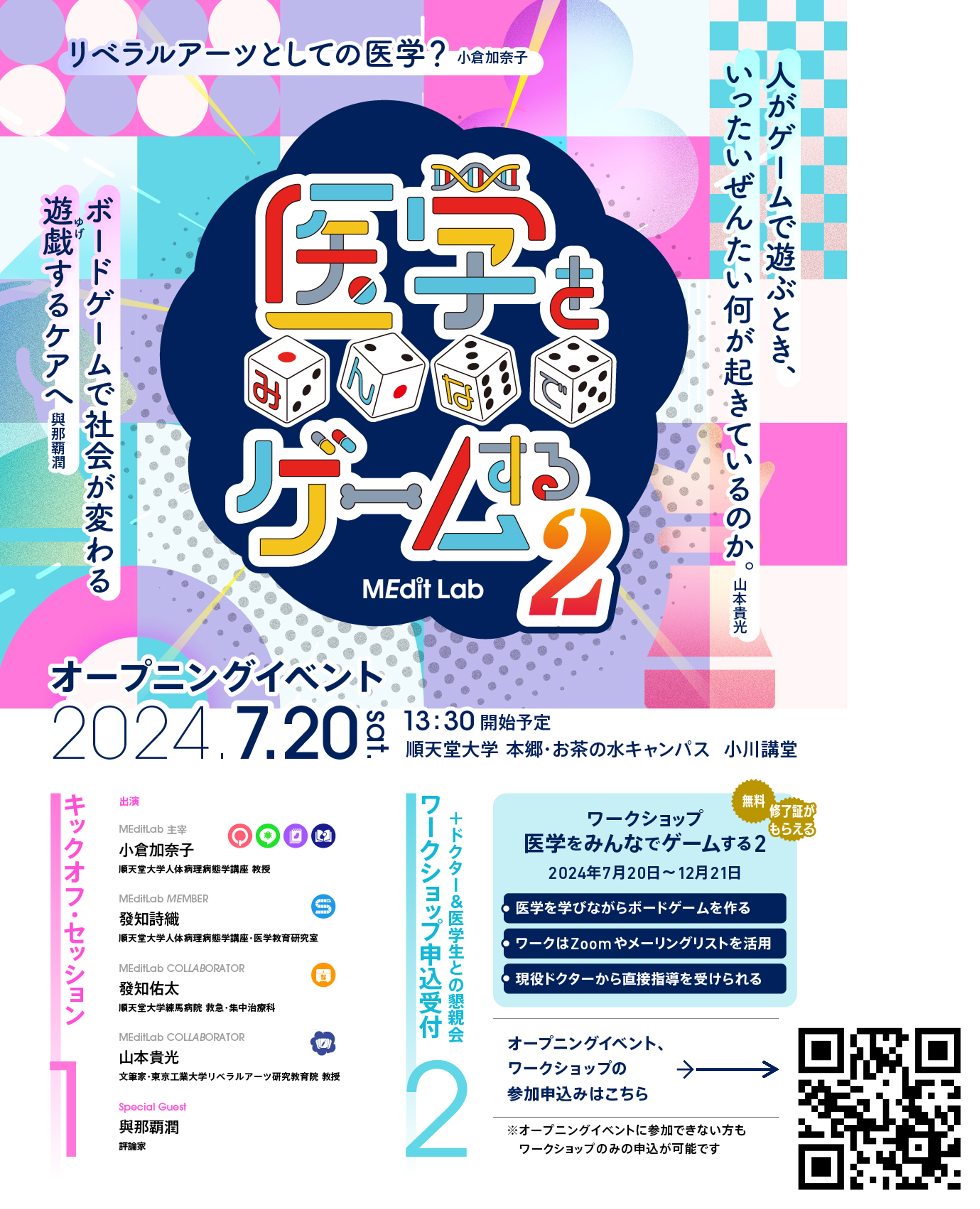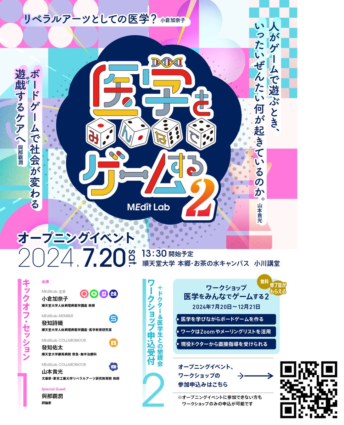 今年(2024)度、ワークショップのカリキュラムをさらにブラッシュアップし、医療従事者を志す大学生および高校生向けのリベラルアーツ教育プログラムとして立案しなおし、2024年6月に令和6年(2024)度の「一般財団法人三菱みらい育成財団(カテゴリ-4)」(https://www.mmfe.or.jp/ )に採択されました。「医学をみんなでゲームする2」のオープニングイベントが7月20日スタートします。