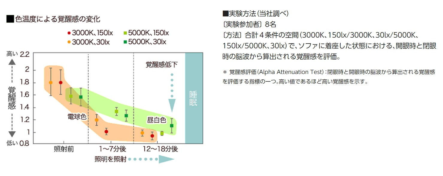 脳波測定器で、照明の色温度による覚醒感の変化を確認したところ、昼白色に比べて電球色のほうが覚醒感が低下することが実証されました。