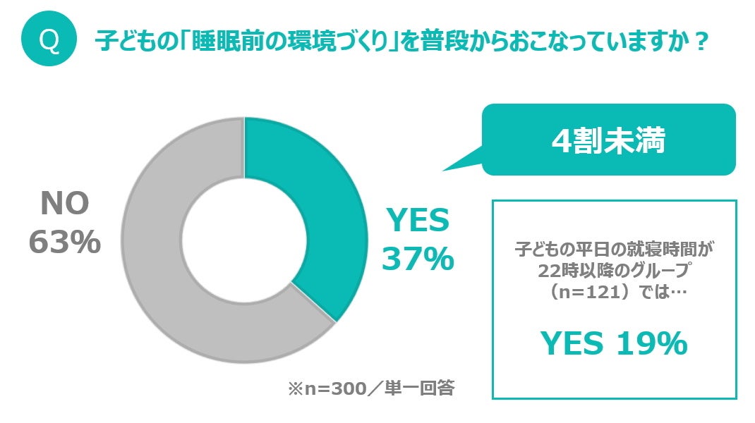 こうした中で重要になってくるのが、子どもに対して理想的な時間に就寝を促す「睡眠前の環境づくり」です。しかし、今回の調査において、睡眠前の環境づくりを「普段からおこなっている」人は37%と4割未満にとどまりました。すなわち、残り6割以上は、睡眠前の環境づくりができていないということになります。また、子どもの平日の就寝時間が22時以降のグループ(n=121)では、睡眠前の環境づくりを「普段からおこなっている」人の割合がわずか19%であることもわかりました。