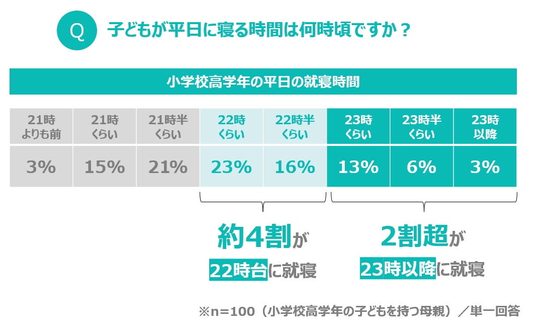なお、子どもたちの就寝時間については、母親の63%が「自分が子どもだった頃よりも寝る時間が遅いことが多い」と回答しています。そこで、母親たちが「子どもと同じ年齢だった頃に寝ていた時間」についても聞くと、低学年に加え、中学年・高学年の母親の最多回答も「21時」となりました(低学年:41%、中学年:44%、高学年:36%)。母親たちが小学校中学年・高学年だった頃と、現在の子どもたちを比較すると、就寝時間が実に1時間も遅くなっていることになります。今回の調査をふまえると、現代は、母親たちの時代よりも「夜更かしチルドレン」が多いと言えそうです。