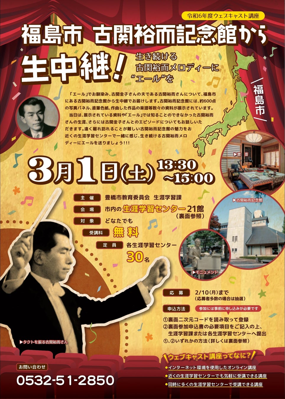 愛知県豊橋市の21か所の生涯学習センターと福島市にある「古関裕而記念館」をオンラインで繋ぎ、「ウェブキャスト講座」を開催します。