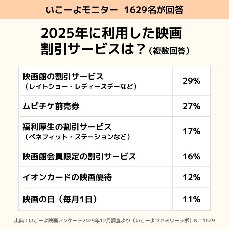 利用されている割引サービスを調査すると、レイトショーやレディースデーなどの「映画館の割引サービス(29%)」や「ムビチケ前売券(27%)」、ベネフィット・ステーションなどの「福利厚生(17%)」と多岐にわたります。