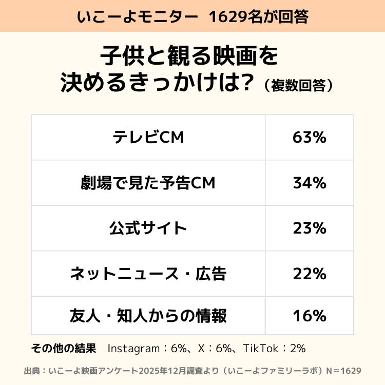 映画を観るきっかけは「テレビCM(63%)」が最多で、「劇場で見た予告CM(34%)」などが続きました。SNSが普及する中でも、親子層への認知においては依然としてテレビCMが大きな影響力を持っていることがわかります。