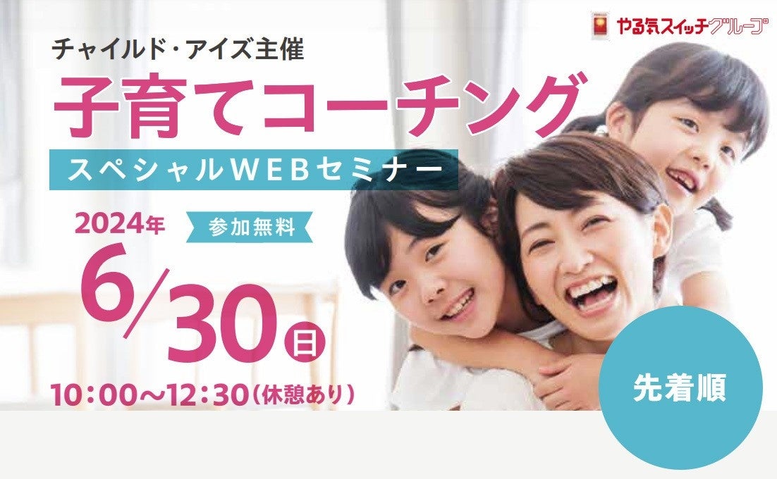 総合教育サービス事業の株式会社やる気スイッチグループ(東京・中央区、代表取締役社長:高橋 直司)が展開する知能育成(知育)と受験対策の幼児教室「チャイルド・アイズ®」では、保護者向けの「子育てコーチングWEBセミナー」を6月30日(日)10:00~12:30にオンラインで開催します。(事前申し込み制、参加費は無料)