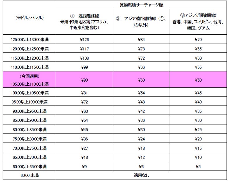JALは日本発国際貨物燃油サーチャージの改定時期を年12回(毎月)としており、また、各月の貨物燃油サーチャージ額は「シンガポールで取り引きされるジェット燃油(ケロシン)価格の前々月の平均値」を燃油指標価格として、2022年4月より導入した以下テーブルに従いサーチャージ額を決定します。