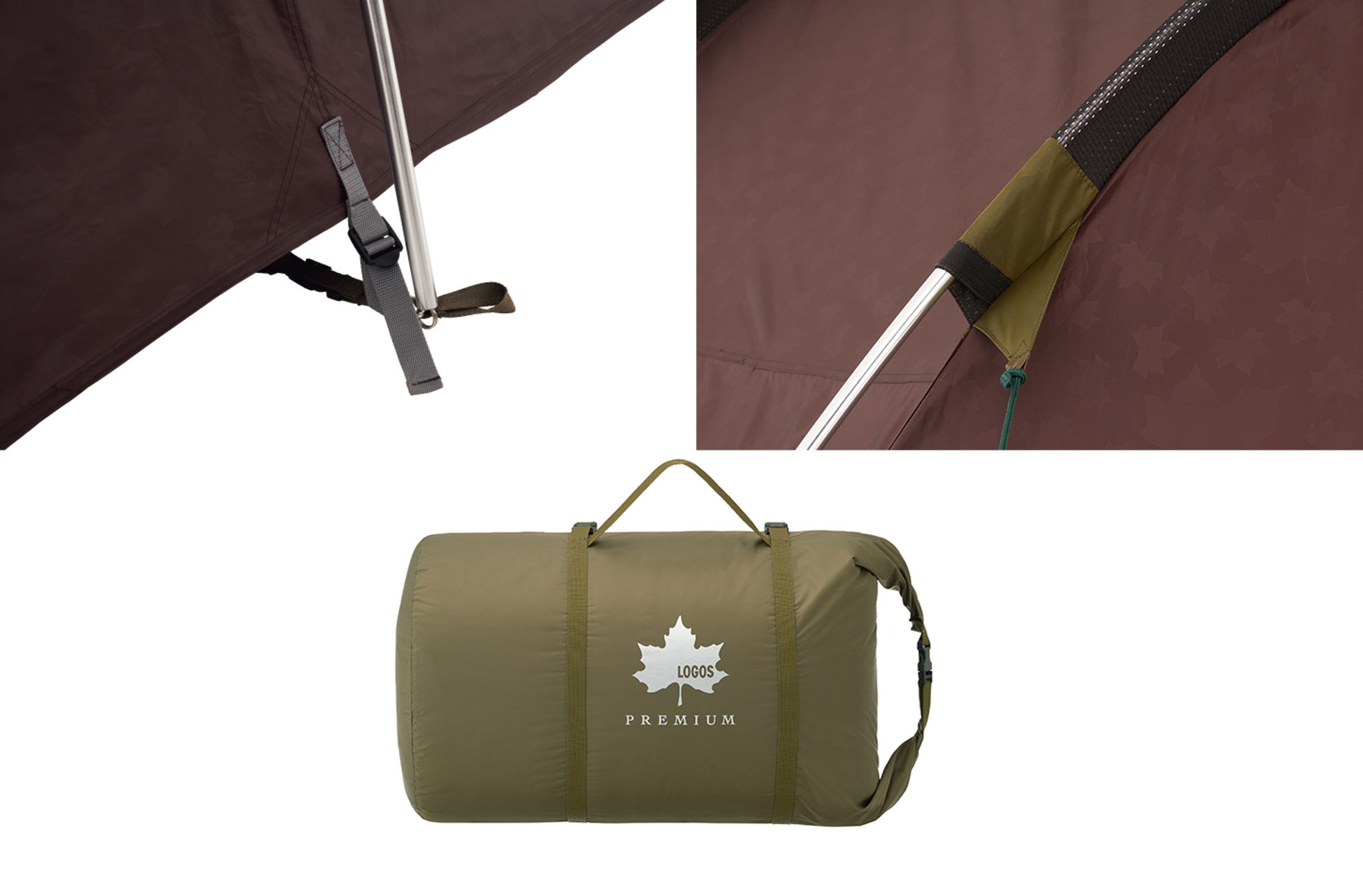 LOGOS独自のPANEL SYSTEMにより、テント前面にフレームをクロス状に組み込むことで、テント全体の強度が向上。2本のポールで支えるだけでテントと一体化したタープとなるため居住空間が広がり、湾曲しているので雨だまりも防止する。さらに付属の車体連結用ジョイントを使えば、車とのリンクもスピーディー。キャノピー使用時はランタンを吊り下げることも可能。