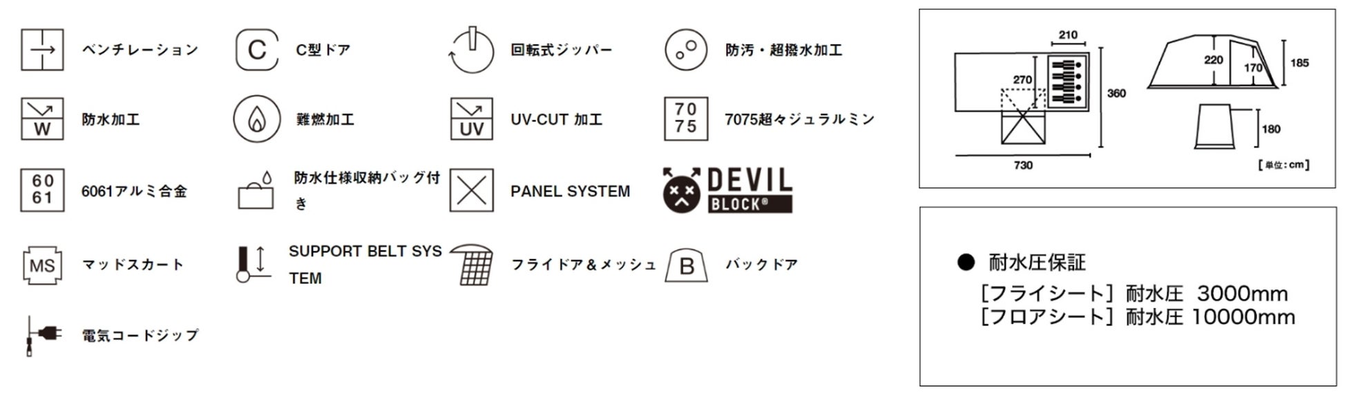 設営を簡単サポートするSUPPORT BELT SYSTEMを採用しており、フレームをセット後に伸ばしたベルトを短く締めるだけで余分な力を使わずに簡単に設営できる。撤収時は汚れや水からアイテムを守る防水仕様の収納バッグ付きで、濡れたフライシートを入れても安心して持ち運ぶことが可能。