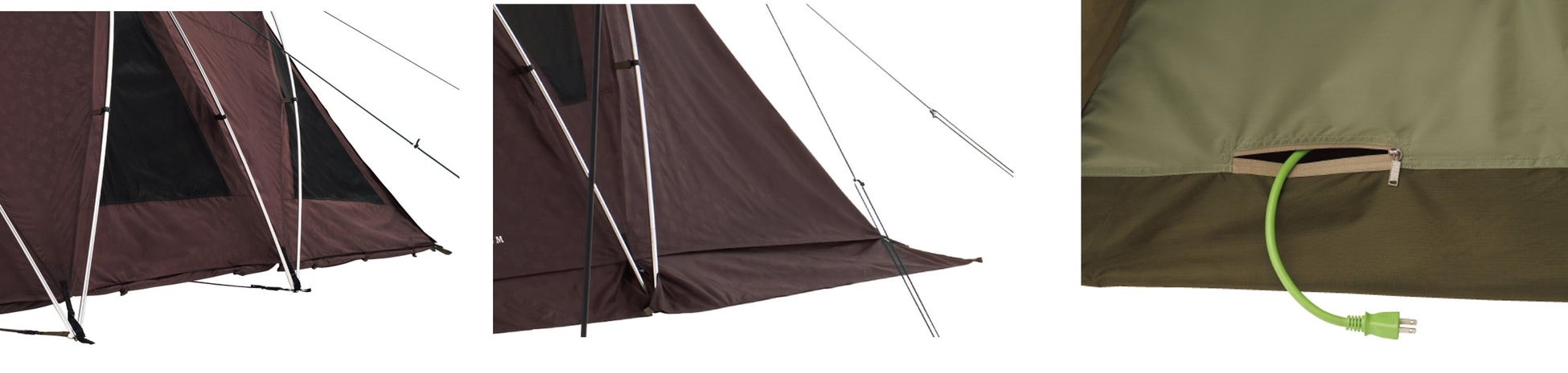 AIR VENT SKIRT SYSTEMにより、巻き上げ可能な昇降式マッドスカートを搭載しており、テント内の通気性がさらにUP。インナーテントには電源コードの取り込み口を設置。ジッパー付きなので冷気をしっかり遮断する。