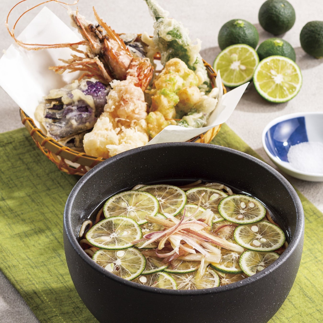 すだちの爽やかな酸味とシャキシャキのみょうがが見た目に涼しいお蕎麦は、冷たいかつお出汁でさっぱりとした口当たり。さくっと揚げた、彩り豊かな天盛りとセットでご用意いたしました。