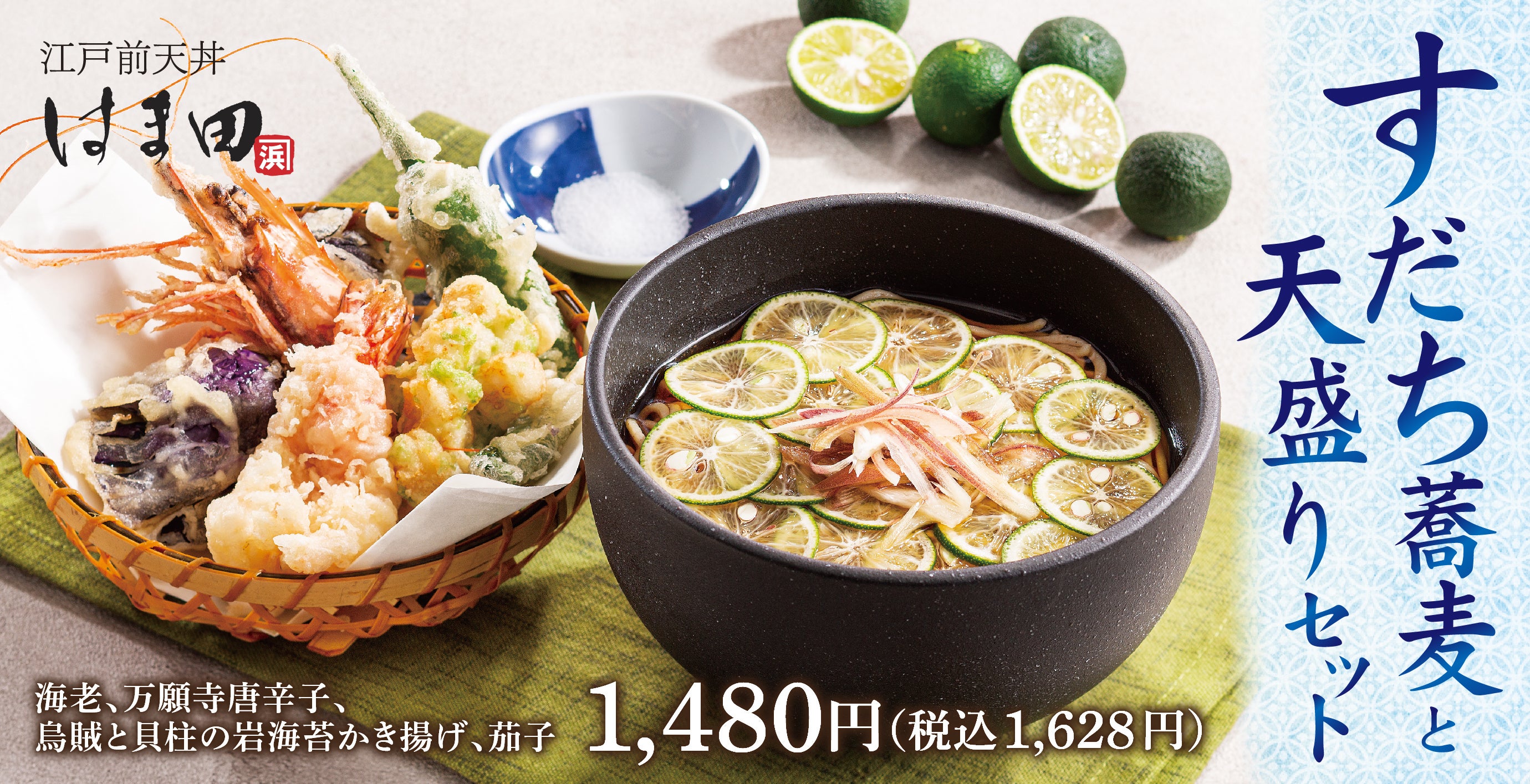 アークランドサービスホールディングス株式会社の⼦会社、とんかつ専⾨店「かつや」を展開している株式会社かつや(本社:東京都千代⽥区/代表:⼤内 勇⼀)は、2022年8月19日(金)より国内「江戸前天丼はま田」にて「すだち蕎麦と天盛りセット」の販売を開始いたします。