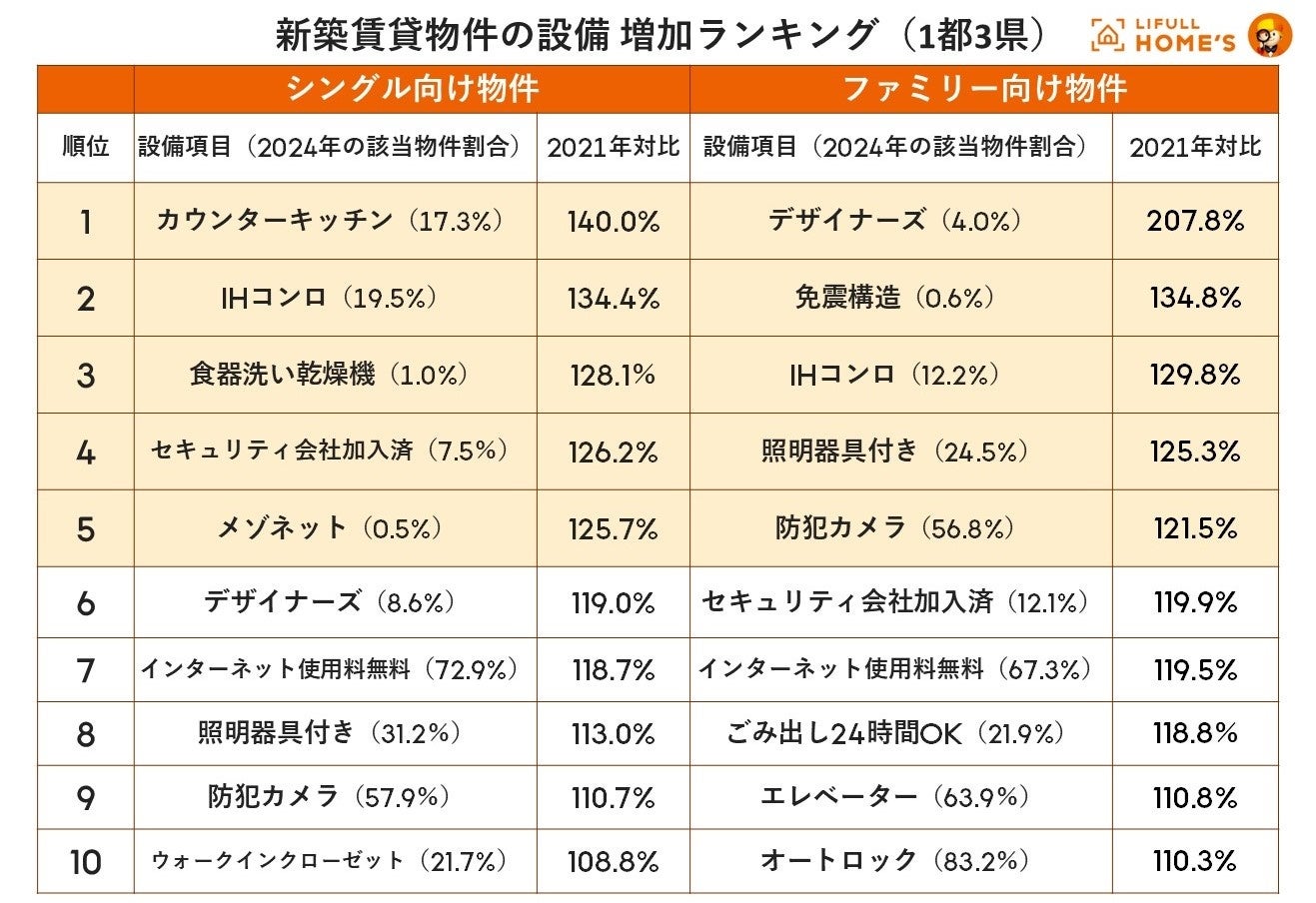 新築の賃貸物件全体のうち、それぞれの設備・条件に該当する物件の割合について、2021年と2024年とを比較し、該当物件の増加率が高い順にランキング化しました。それぞれの結果についてLIFULL HOME'S PRESS編集部渋谷の考察と共にご紹介します。
