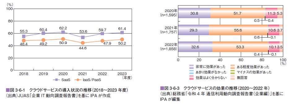 白書では、SaaS導入企業が2023年度は6割を超え、実際に導入した企業では8割以上が効果を実感しているという調査結果が紹介されており、クラウドサービスの普及について「クラウドサービスの利用はもはや特別な選択肢ではなく、定着しつつあると思われる」と言及しています。