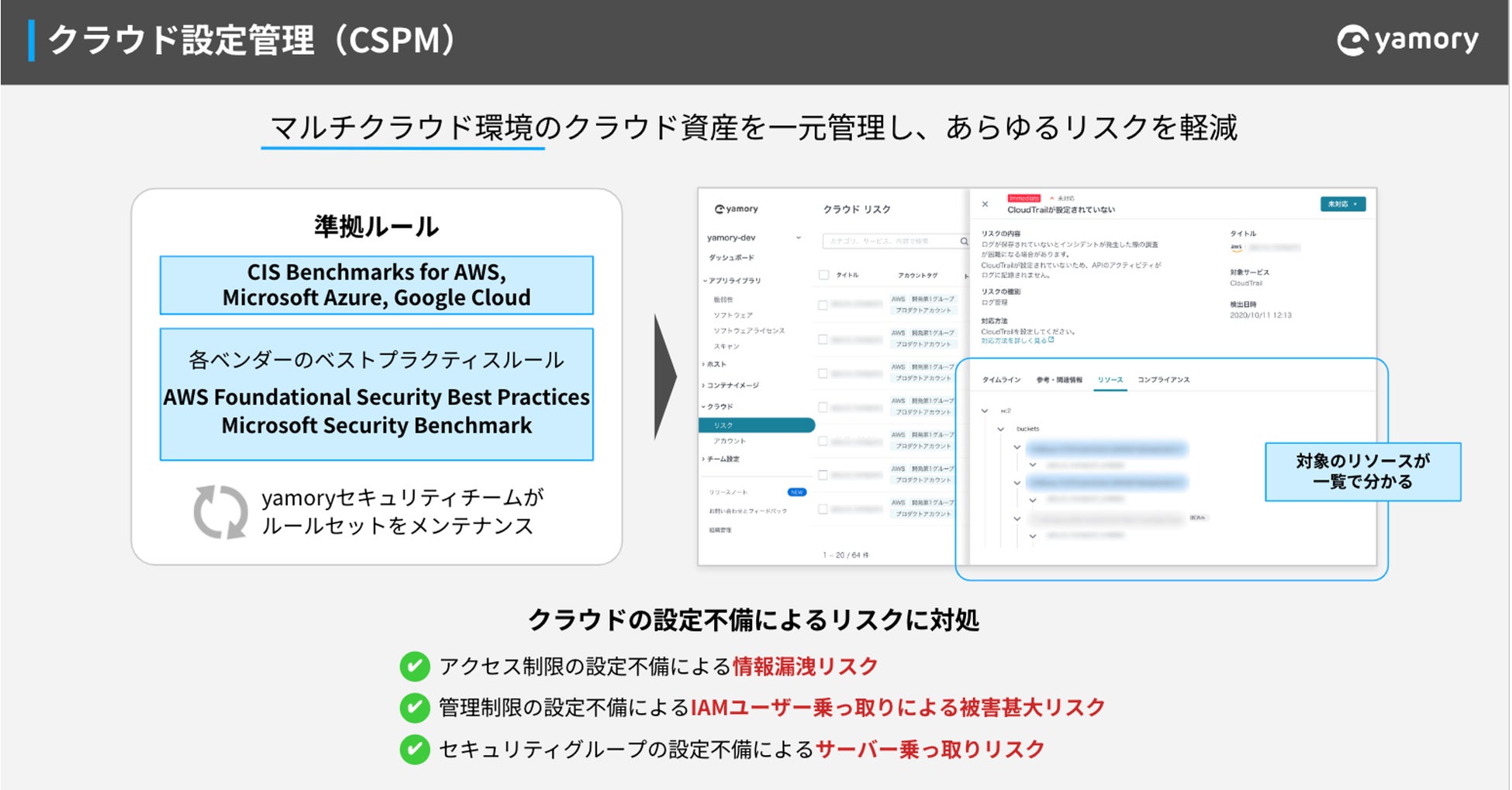 「(b)IaaS/PaaS利用時の設定ミス」については、悪意のない人為的なミスで発生する場合があります。人が作業する以上、このようなミスを無くすことはできないため、セキュリティ上の不備がある設定値が投入された場合に検知できる仕組みが必要となります。IaaS/PaaSにおける設定値を検査するソリューションとして「CSPM(Cloud Security Posture Management)」があり、こういった製品を導入していくことも対策の一つとなります。例えば、弊社サービスである脆弱性管理クラウド「yamory」(https://yamory.io/)も「クラウド設定管理(CSPM)」機能を有しています。