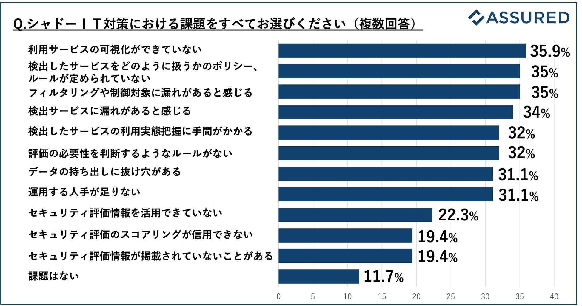 また、このようなインシデントが発生する背景について、白書では「社内のセキュリティ担当の目の届かないところでも容易に導入できてしまうSaaS の手軽さがあると推察される。また、クラウドサービスの性質上、サービスの機能やデータには一般にインターネットを経由したアクセスが可能であるため、これが漏えいの可能性とも結び付く」と言及しています。会社の許可なく利用されているクラウドサービスは「シャドーIT」と呼ばれ、情報漏えい等のリスクを大きく引き上げます。Assuredの調査(※2)では、大手企業の約9️割がシャドーIT対策に課題があることが明らかになっています。