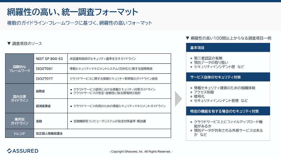 Assuredでは、「クラウドセキュリティ標準」を含む複数のフレームワークやガイドラインに基づき、クラウドサービス事業者からセキュリティ情報を収集し、弊社のセキュリティ専門家がリスク評価を行い、調査結果をレポートとして提供しています。このようなレポートを活用いただくことも有効な対策の一つになります。