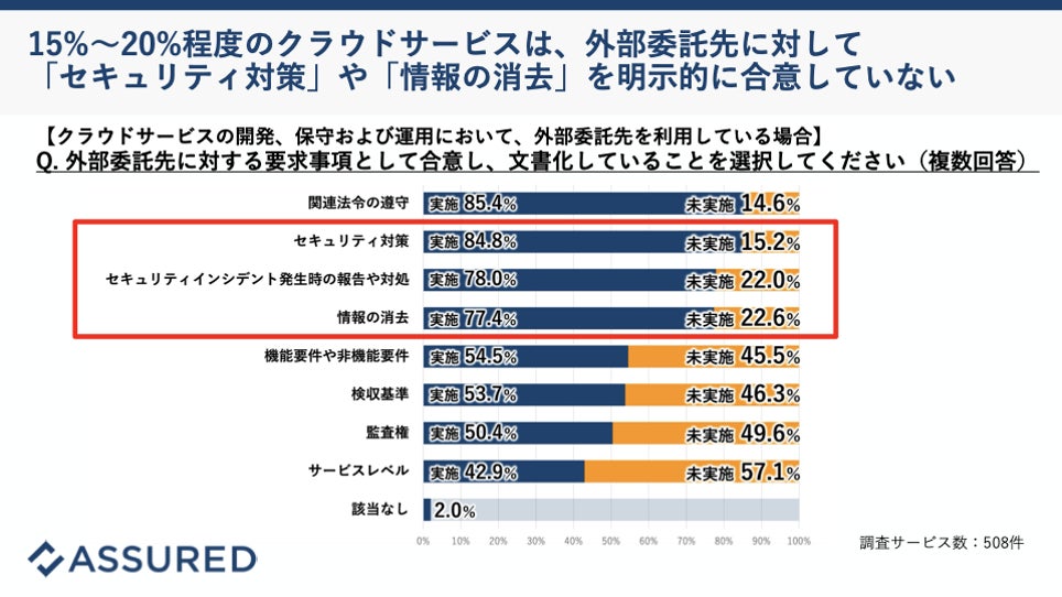 また、「(2)サイバー攻撃によるインシデント事例」では、「(b)ランサムウェア攻撃の事例」や「(c)業務委託先経由のサイバー攻撃の事例」についても取り上げられていました。ITサプライチェーン全体でセキュリティ水準を担保することは、攻撃が激化する昨今では必須の事項となっています。Assuredが実施したクラウドサービス事業者のランサムウェア対策実態調査(※3)では、約3割でウイルス対策ソフトが導入されておらず、バックアップ対策としてリストアテストを実施しているのは半数以下という結果が出ています。また、サプライチェーン管理の実態調査(※4)では、約6割が開発、保守・運用業務を外部委託するなか、そのうち約2割は委託先と「セキュリティ対策」や「情報の削除」を合意していないことも明らかになっています。