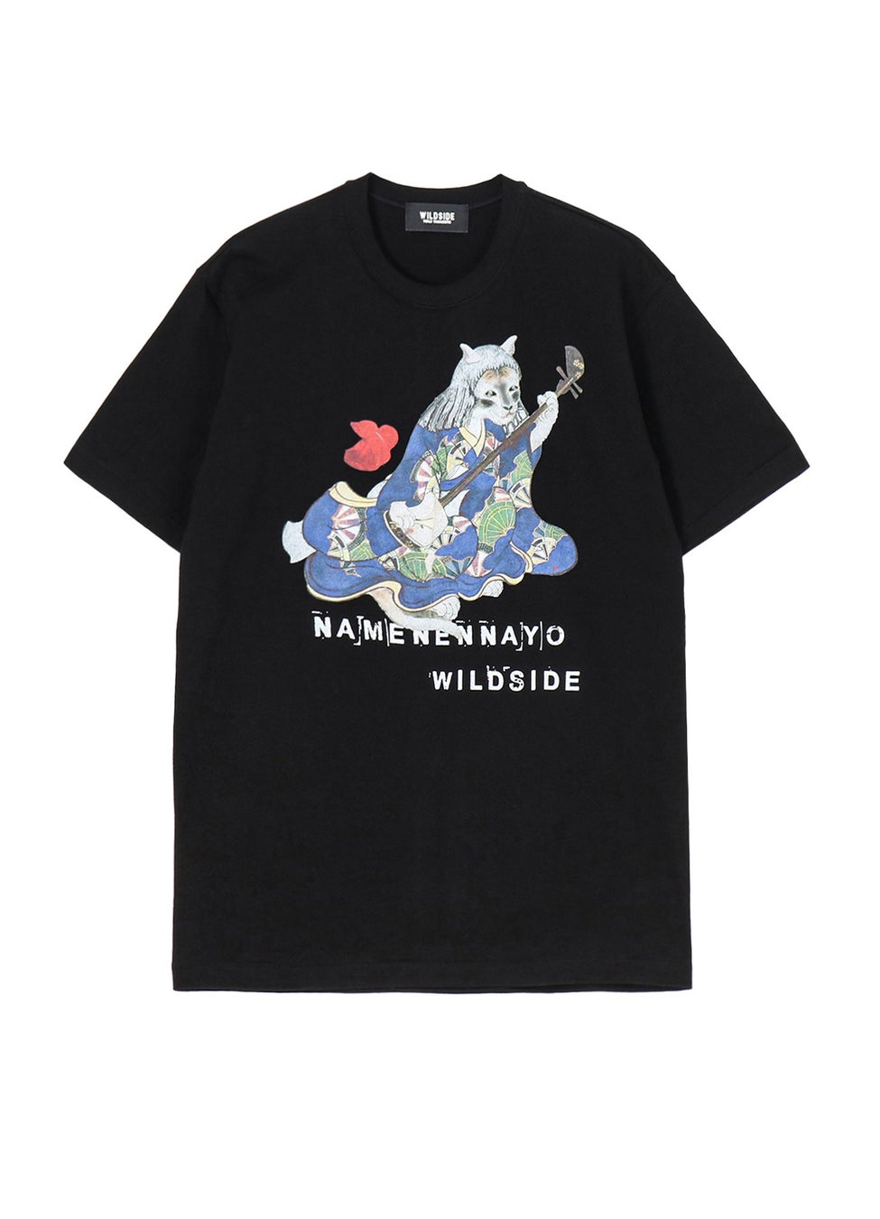 フロントに大きくデザインされた三味線を持つ猫女、女性に抱かれる猫、迷い猫の張り紙のような猫と福助のグラフィックは独特で、インパクトのあるデザインとなっています。1サイズ展開のため、1枚でもゆったりと着られるアイテムです。