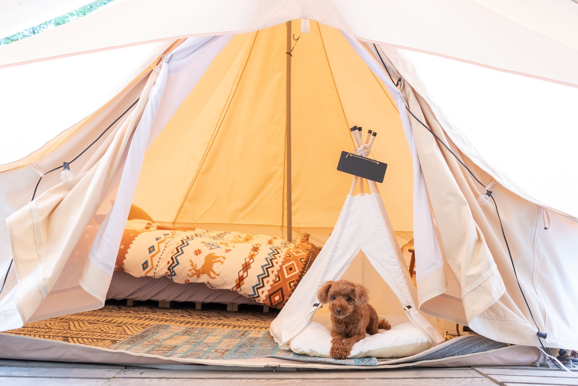 ときたまひみつきちCOMORIVER、わんちゃんが主役のグランピングステイ。川沿いで愛犬と一緒に泊まれる「ドッググランピングテント」の提供を開始