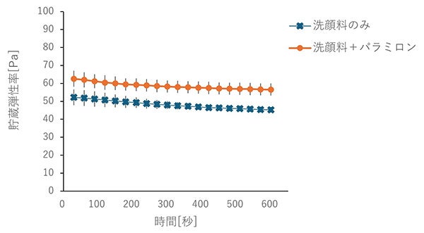 また、パラミロン原末を配合していない洗顔料の泡では、スプーンをのせると、泡の中に沈んでしまいますが、パラミロンを配合した洗顔料では、スプーンをのせても泡の中にスプーンが沈まず、泡が弾力を持っていることが分かりました。実際に、泡の弾力の指標としてそれぞれの泡の貯蔵弾性率※7を調査したところ、パラミロン原末を配合した洗顔料の泡において、パラミロン原末を配合していない洗顔料の泡と比較して、泡の貯蔵弾性率が高くなっていました(図6)。これらの結果は、洗顔料へのパラミロンの配合によって、より弾力ある泡立ちが得られることを示しています。