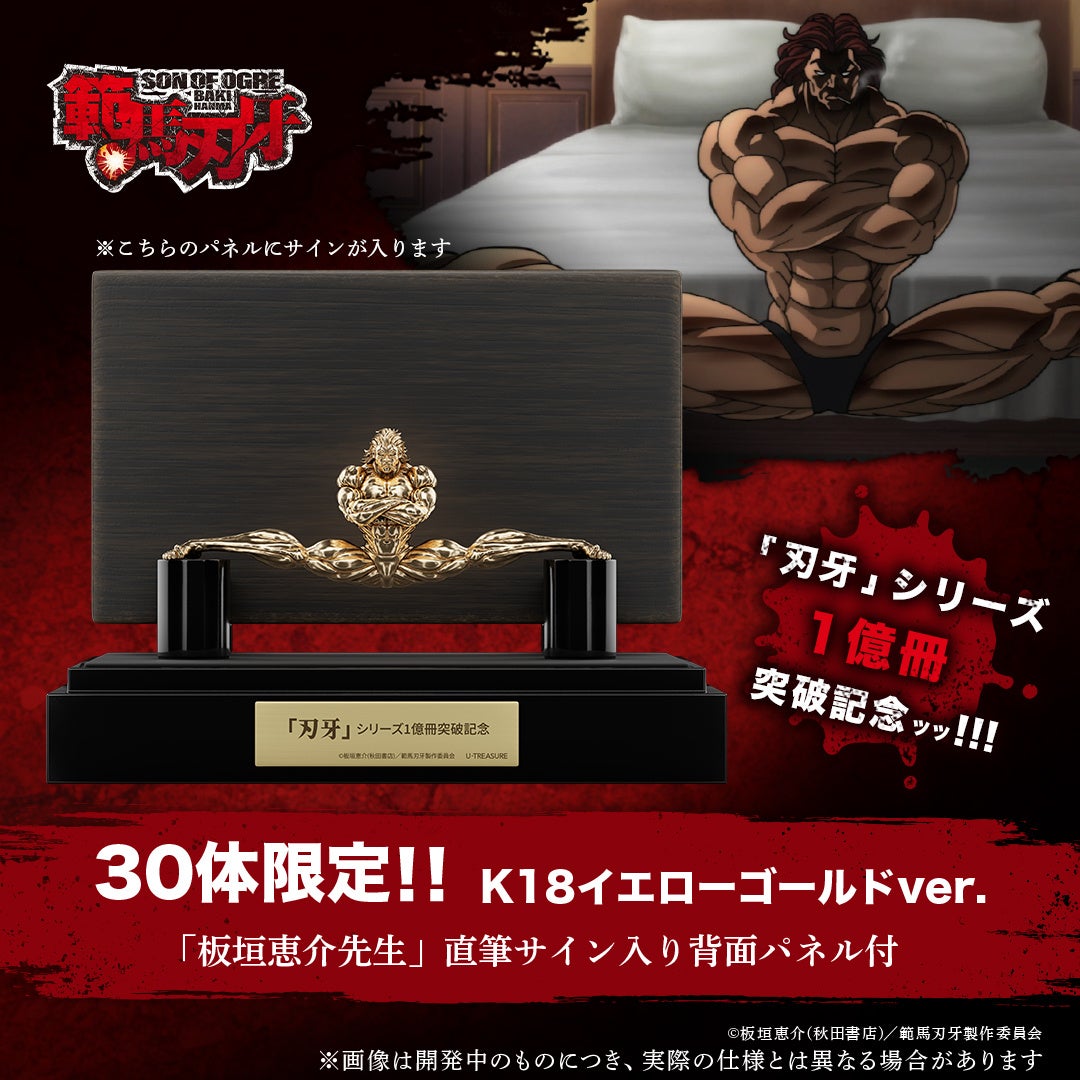 株式会社ユートレジャー(本社:東京都新宿区、代表取締役:伊藤 崇史)は、「刃牙」シリーズ原作1億冊突破を記念してアニメ「範馬刃牙」範馬勇次郎プレミアムフィギュアを2024年5月21日(火)~8月15日(木)の期間限定で予約受付を行います。K18イエローゴールドは30体、シルバー925は100体の数量限定です。K18イエローゴールドは背面パネルに「板垣恵介先生」の直筆サイン入り。期間中、ユートレジャーコンセプトストア池袋にてサンプルを展示します。