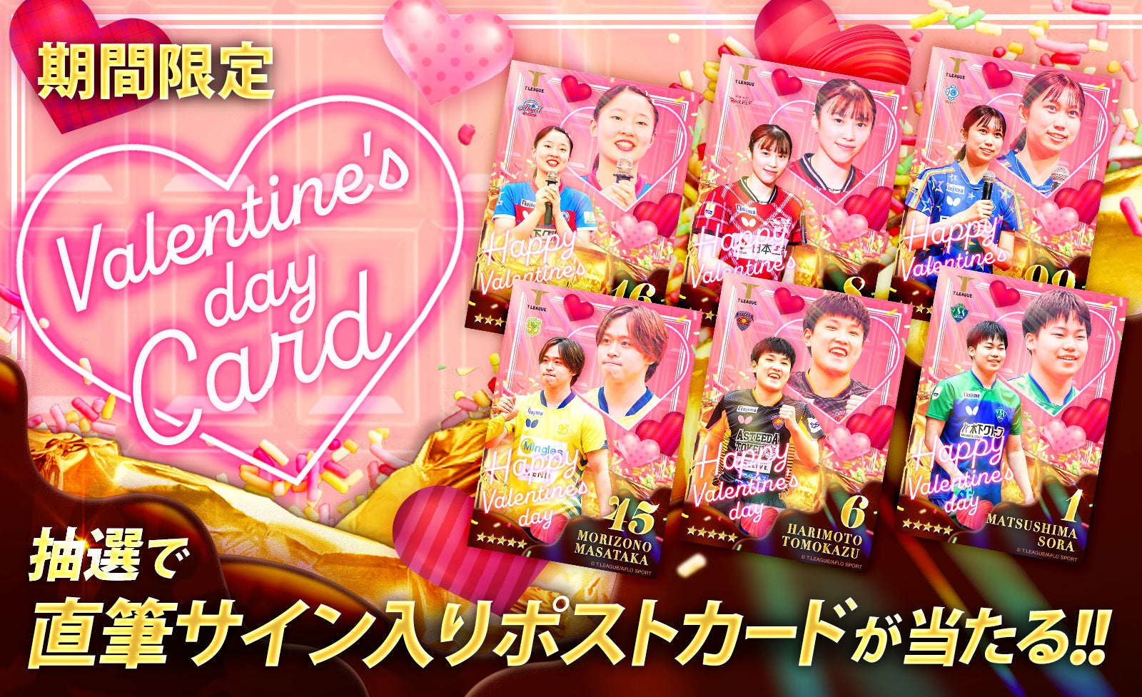 いよいよ3月にノジマTリーグ プレーオフの開催が迫る中、Tリーグカードではプレーオフ進出を目指す各チームのファンの皆様が盛り上がれるようバレンタインキャンペーンを開催いたします。