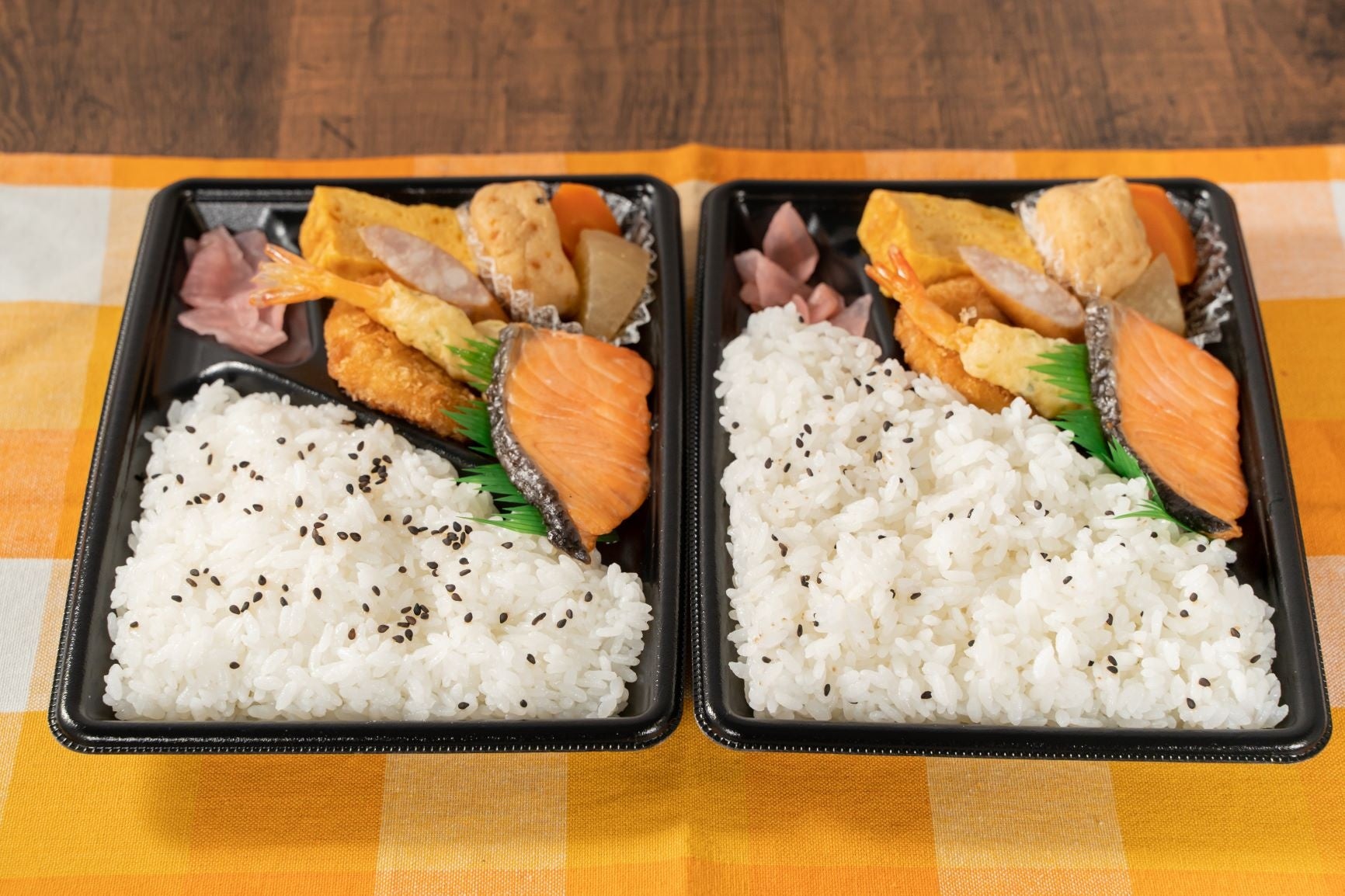 【内容】ふっくらと焼き上げた銀鮭、かつおだしがきいた風味豊かな煮物、海老天、コロッケなどを盛り込んだ幕の内弁当です。ごはんを20%増量しました。