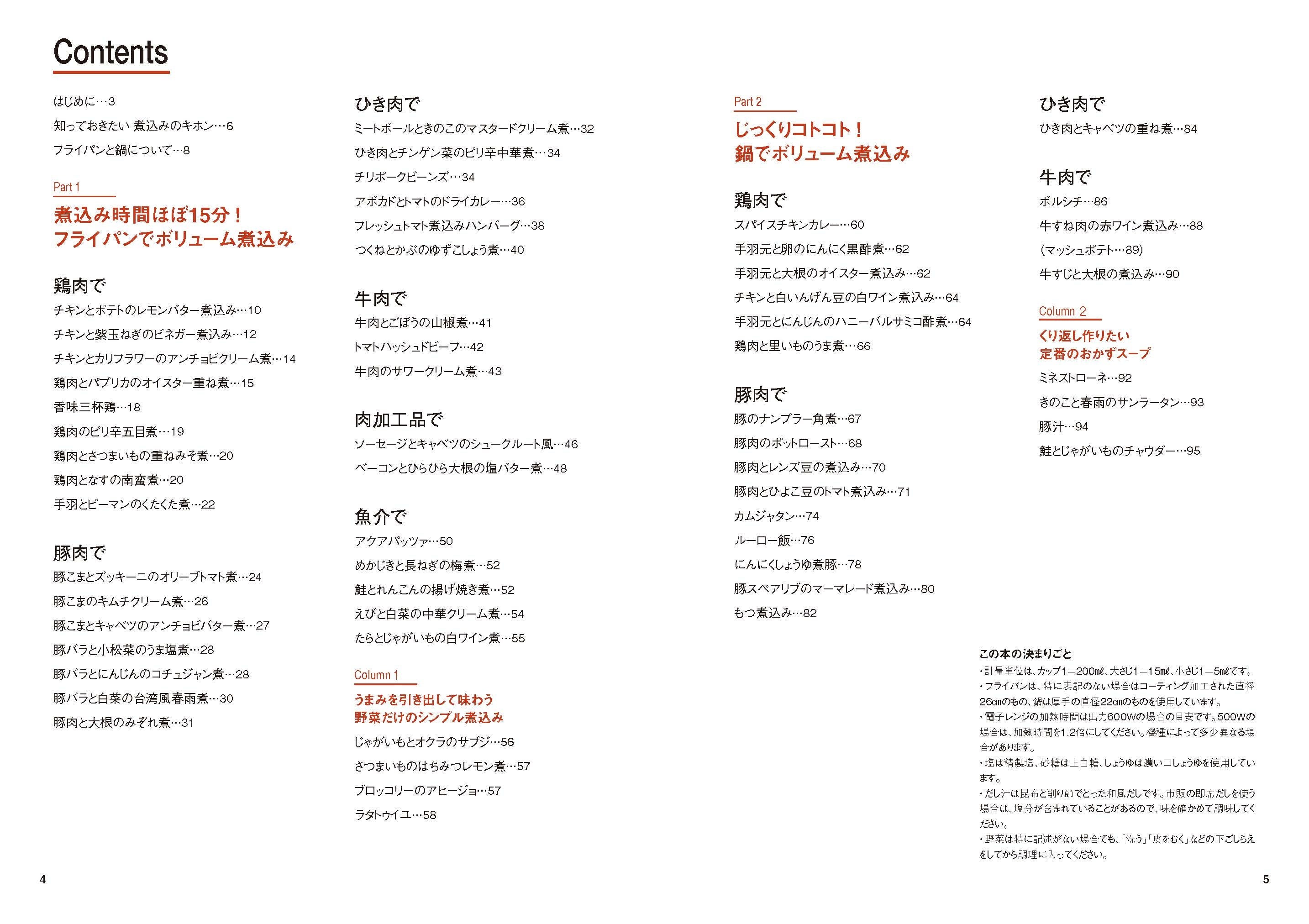 焼き煮、炒め煮、蒸し煮など、フライパンの特性を生かして手軽に作れる煮込みと、鍋を使って、かさのある野菜や厚みのある肉などをじっくり煮込むことでおいしさが増す煮込みを全59レシピ紹介しています。