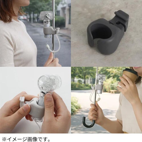 対応サイズに適したハンディファンを日傘の中棒に取り付けるためのクリップ。ハンディファンと日傘を片手で持つことができるので、空いた手でハンカチを出したり、スマートフォンを取り出したり、ちょっとした煩わしさを解消します。クリップ単体でセットすれば、ハンディファンのスタンドとしても使用可能。