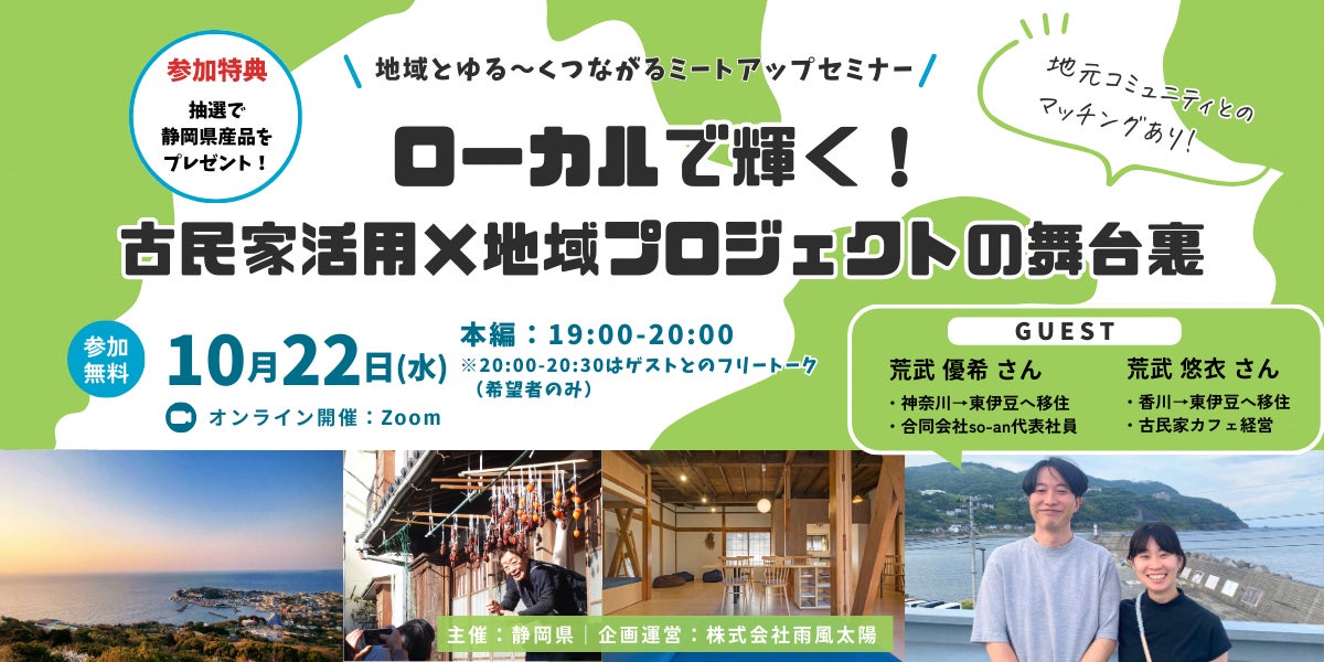 若手移住者や二地域居住者が増えている静岡県の伊豆半島地域で、古民家を活用した地域プロジェクトを行う元気なご夫婦をお招きしたオンライントークイベント!