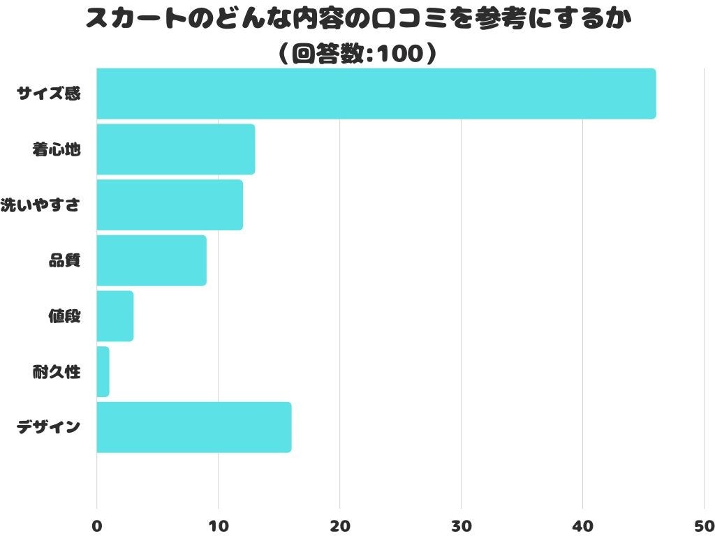 スカートのどんな内容の口コミを参考にするかをアンケートにて調査したところ、1位は「サイズ感」でした。