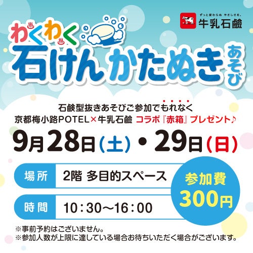 株式会社JR西日本ホロニック(京都市下京区/代表取締役 長田一郎)が運営するUmekoji Potel KYOTO(梅小路ポテル京都)は、客室オリジナルアメニティ(ポテルオリジナルロゴ入り赤箱石けん)や梅小路銭湯 ぽて湯、「銭湯ギャラリー」イベント等オープン当時よりコラボレーションしてきた牛乳石鹼共進社株式会社(大阪市城東区/代表取締役社長 宮崎悌二)と共に2024年9月28日(土)と29日(日)の2日間、「わくわく石けん型ぬきあそび」を開催いたします。