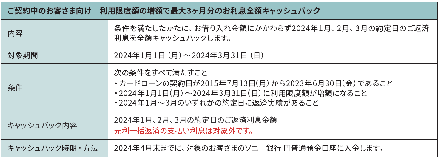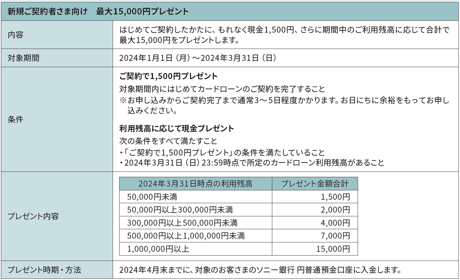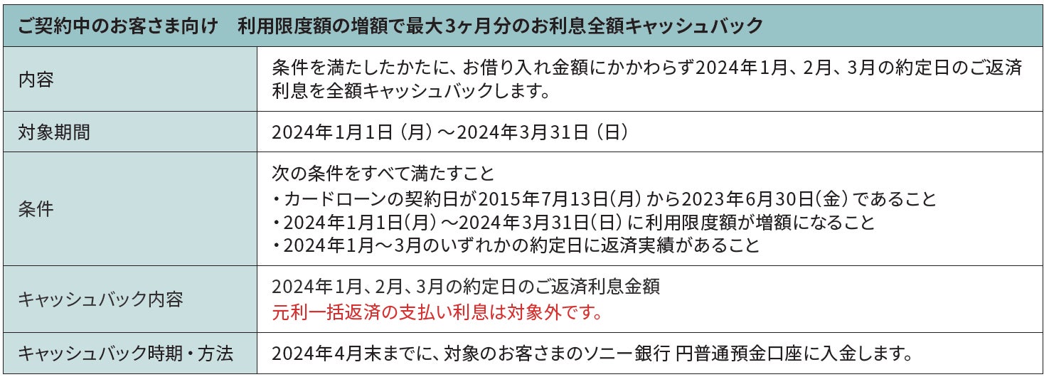 ソニー銀行株式会社(代表取締役社長:南 啓二/本社:東京都千代田区/以下 ソニー銀行)は、2024年1月1日(月)より、カードローンの新規ご契約者さま、ならびにご契約中のお客さま向けにキャンペーンを開始しましたのでお知らせいたします。