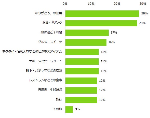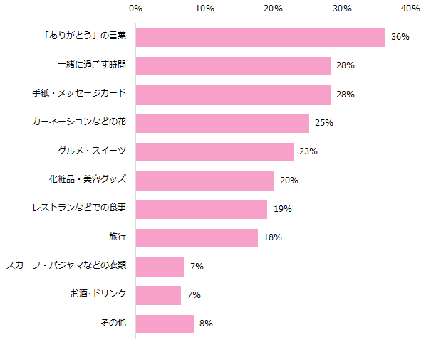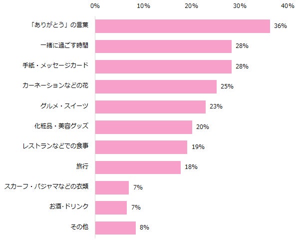 「子どもがいる」と回答した方に母の日、父の日に欲しいプレゼントを伺ったところ、第1位は男女共に「ありがとうの言葉」(女性:36%、男性:29%)でした。女性の第2位は同率28%で「一緒に過ごす時間」「手紙・メッセージカード」でした。