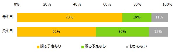 「今年の母の日・父の日にプレゼントを贈る予定はありますか?」と伺ったところ、母の日にプレゼントを贈る予定の方は70%、父の日に贈る予定のある方は52%でした。