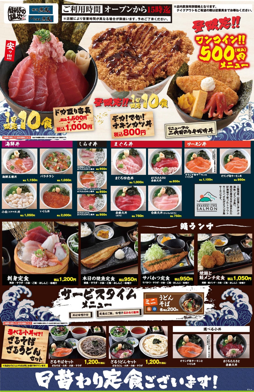 オープンから15時迄のサービスタイム(※2)限定で、「ドカ盛り店長(海鮮丼)税込1,000円」と「デカ!でか!チキンカツ丼(税込800円)」を一日10食限定で販売するほか、ワンコイン(税込500円)メニューとして、リニューアルしてさらに美味しくなった「二代目のり弁風特丼」や、ご飯と味噌汁が”おかわり無料”の「日替わり定食」など、家計を応援する”得ランチ”を販売します。