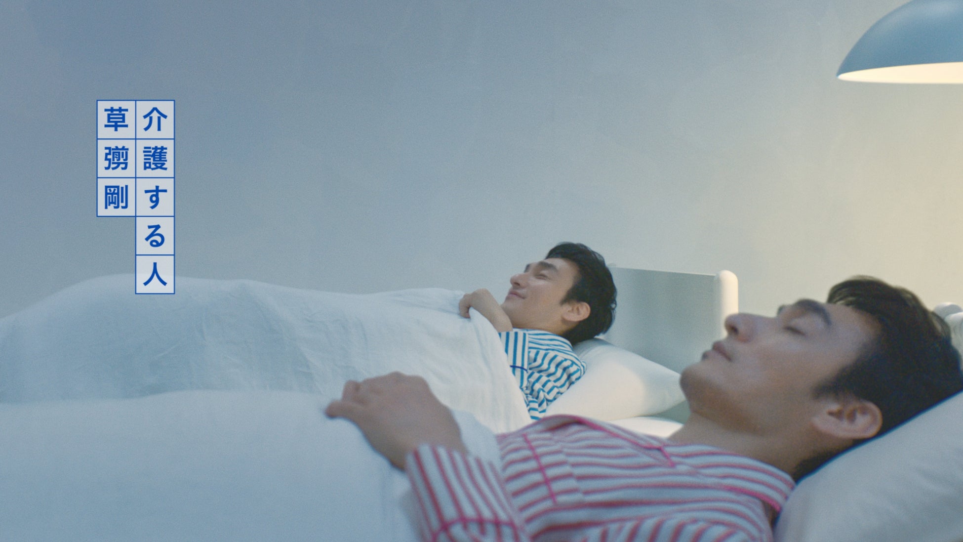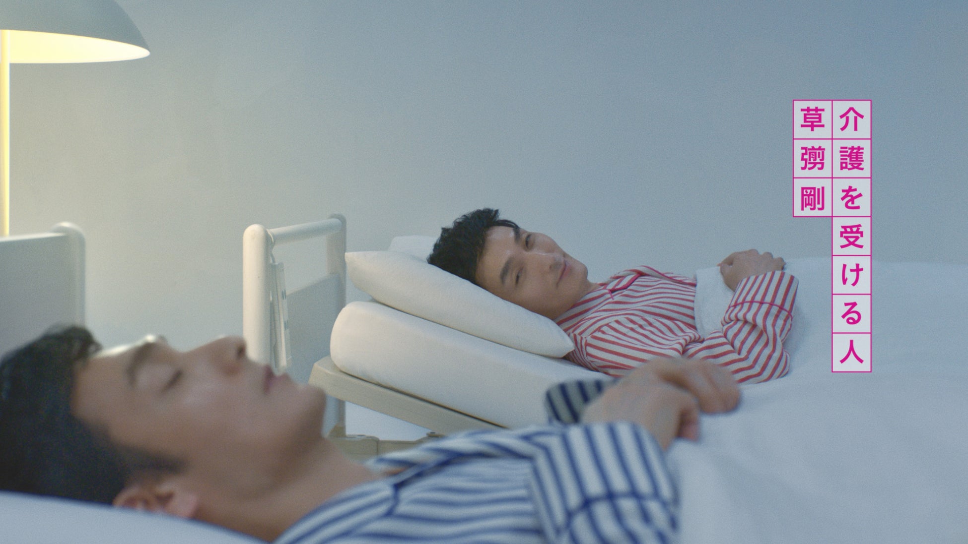 CM内では、草彅さんが“介護する人・介護を受ける人”の一人二役で登場。「夜1枚安心パンツ」を使うことで、睡眠の途中で起きることなく「ス~ス~」とぐっすりと眠る“介護を受ける草彅さん”と、そんな様子を見て安心して「ぐ~ぐ~」と眠る“介護する草彅さん”の二者がすっきりした良い朝をむかえることができたという様子が描かれています。