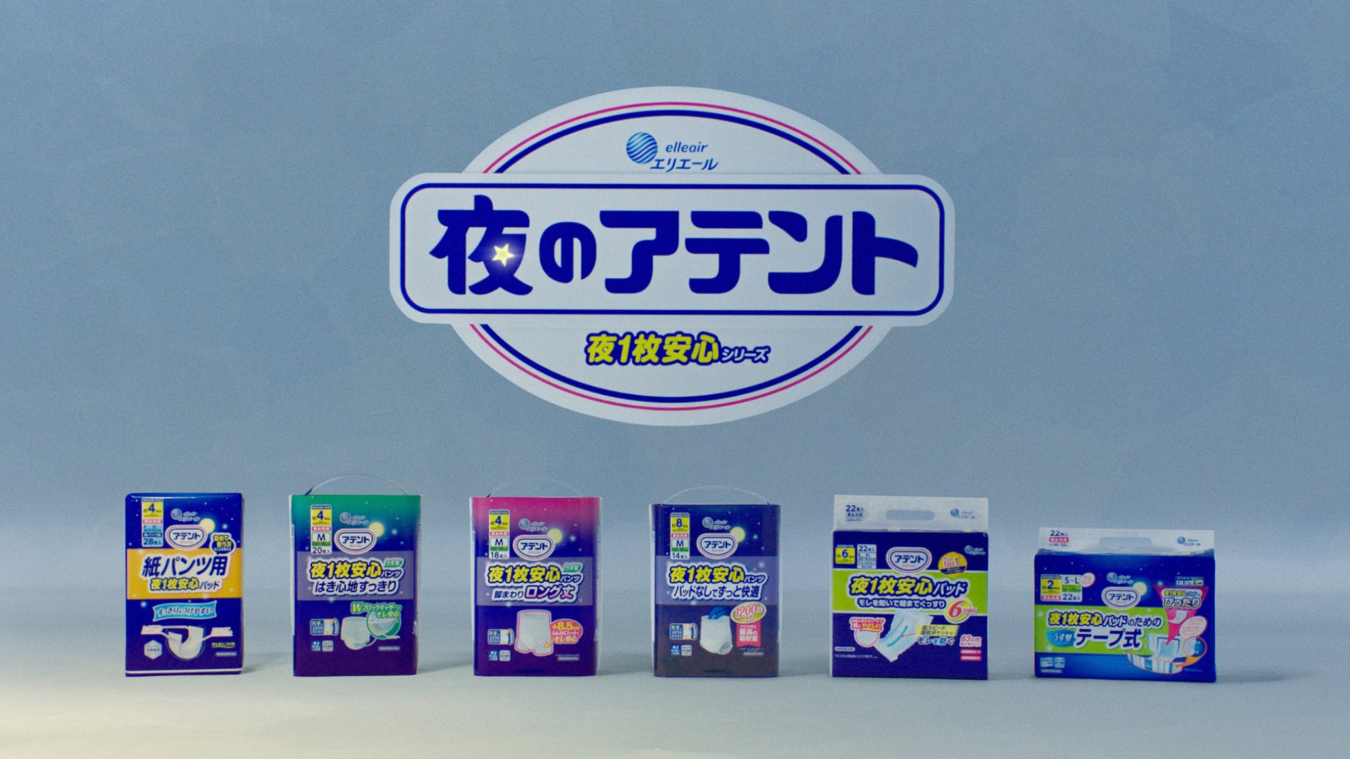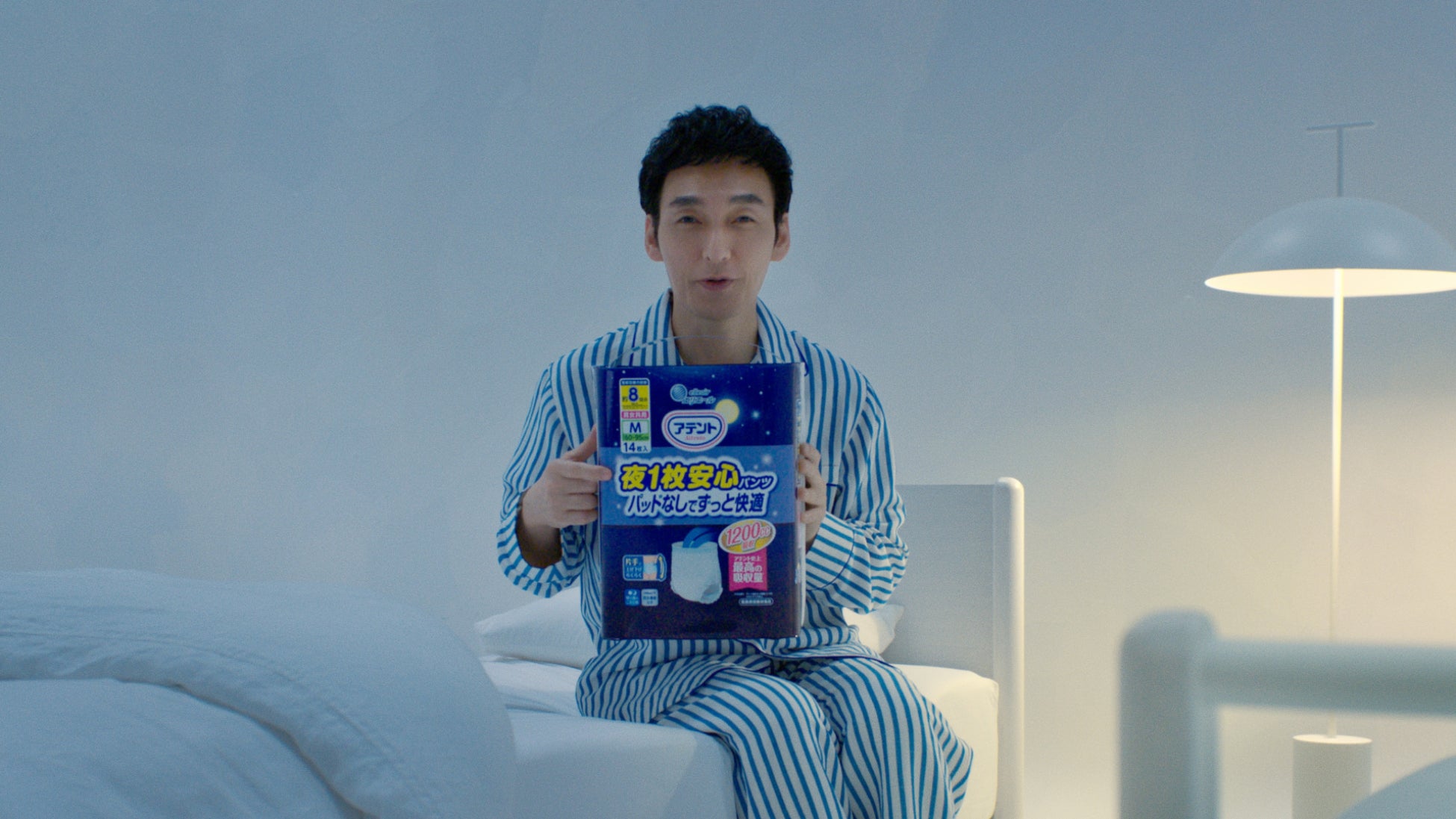 今回のCMでは、介護をする人・介護を受ける人の睡眠の質向上を目指す「アテント 夜 1枚安心シリーズ」の中から、アテント紙パンツ史上最多の吸収量※1を実現して今年10月にリニューアルした『アテント 夜 1枚安心パンツ パッドなしでずっと快適』を紹介しています。