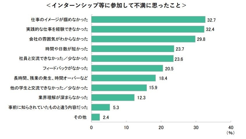 ○不満点は「仕事のイメージが掴めなかった」「実践的な仕事を体験できなかった」が上位