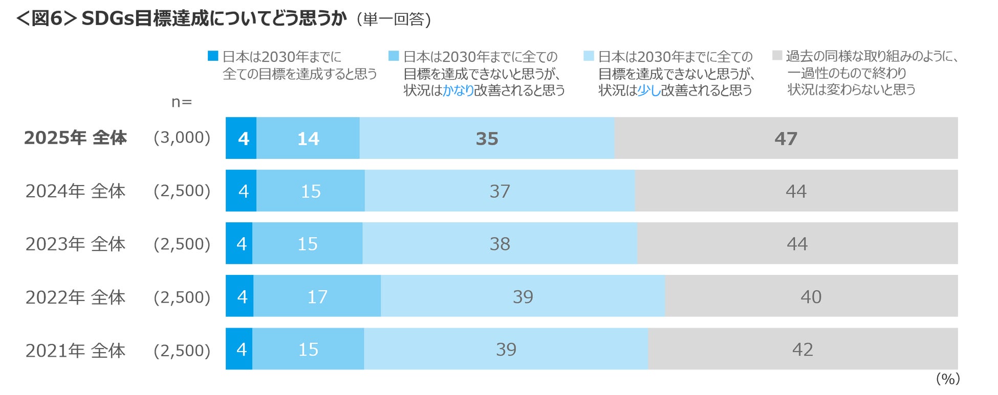 SDGs活動への考えは、「過去の同様な取り組みのように、一過性のもので終わる」が47%と半数に迫っている。「目標を達成はできないと思うが状況は少し改善されると思う」は35%であった。<図6>