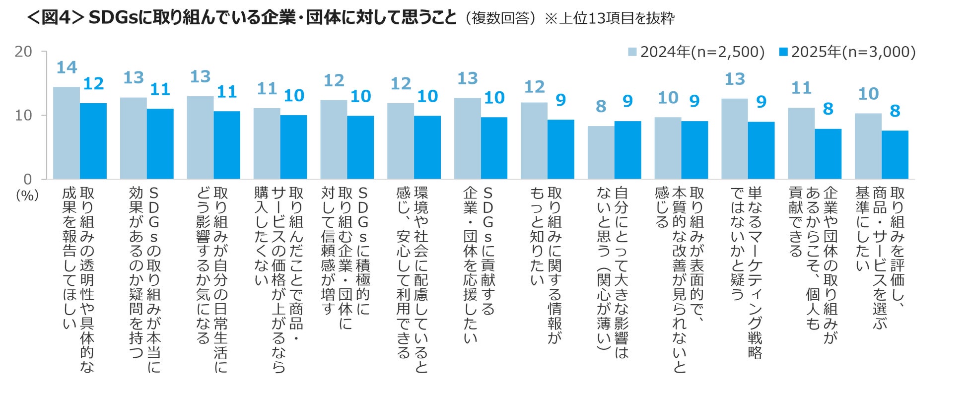 取り組んでいる企業・団体に対しては、「取り組みの透明性や具体的な成果を報告してほしい」12%、「SDGsの取り組みが本当に効果があるのか疑問を持つ」「取り組みが自分の日常生活にどう影響するか気になる」11%とややネガティブな意見があげられた。<図4>