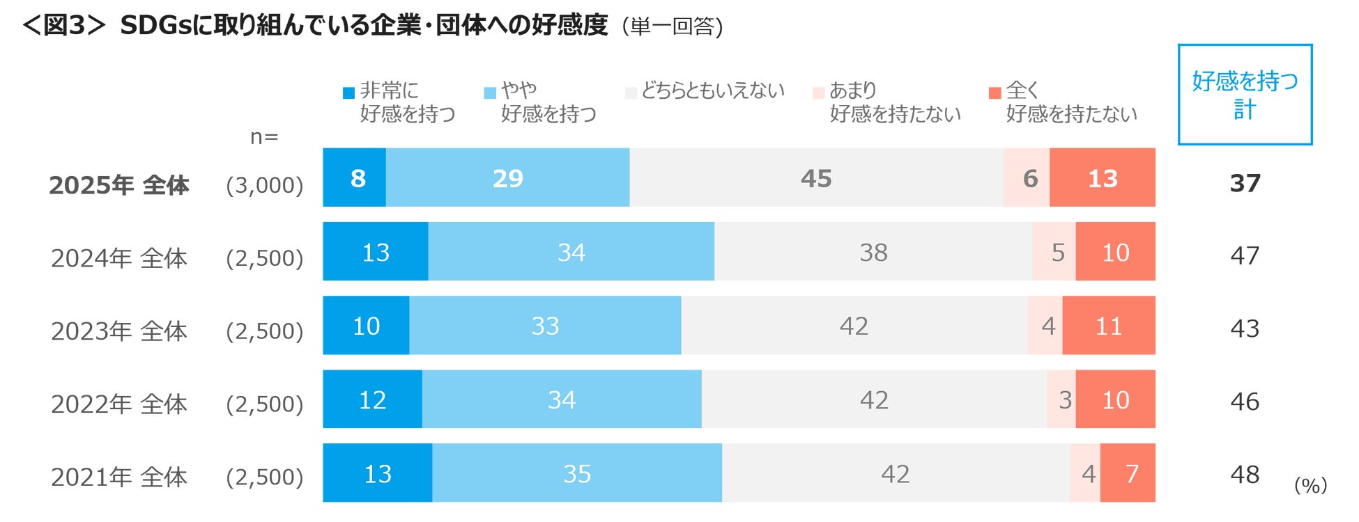 SDGsに取り組んでいる企業・団体への好感度は37%、昨年より10ptの後退。<図3>