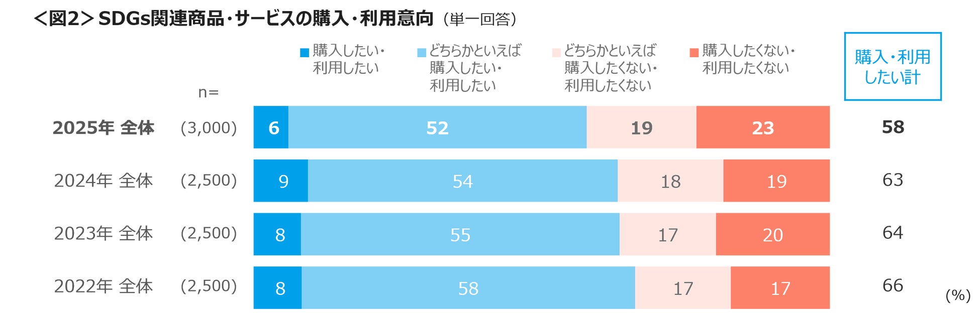 関連商品の購入や利用意向は58%で、昨年より5ptの減少。2022年をピークに減少傾向は続いており、今回は過去4年間での最低値となった。<図2>
