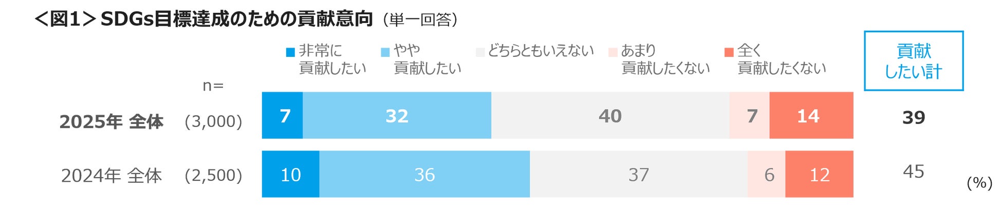 SDGs目標達成のために貢献したい(非常に+やや)は、39%で、昨年より6ptの減少。<図1>