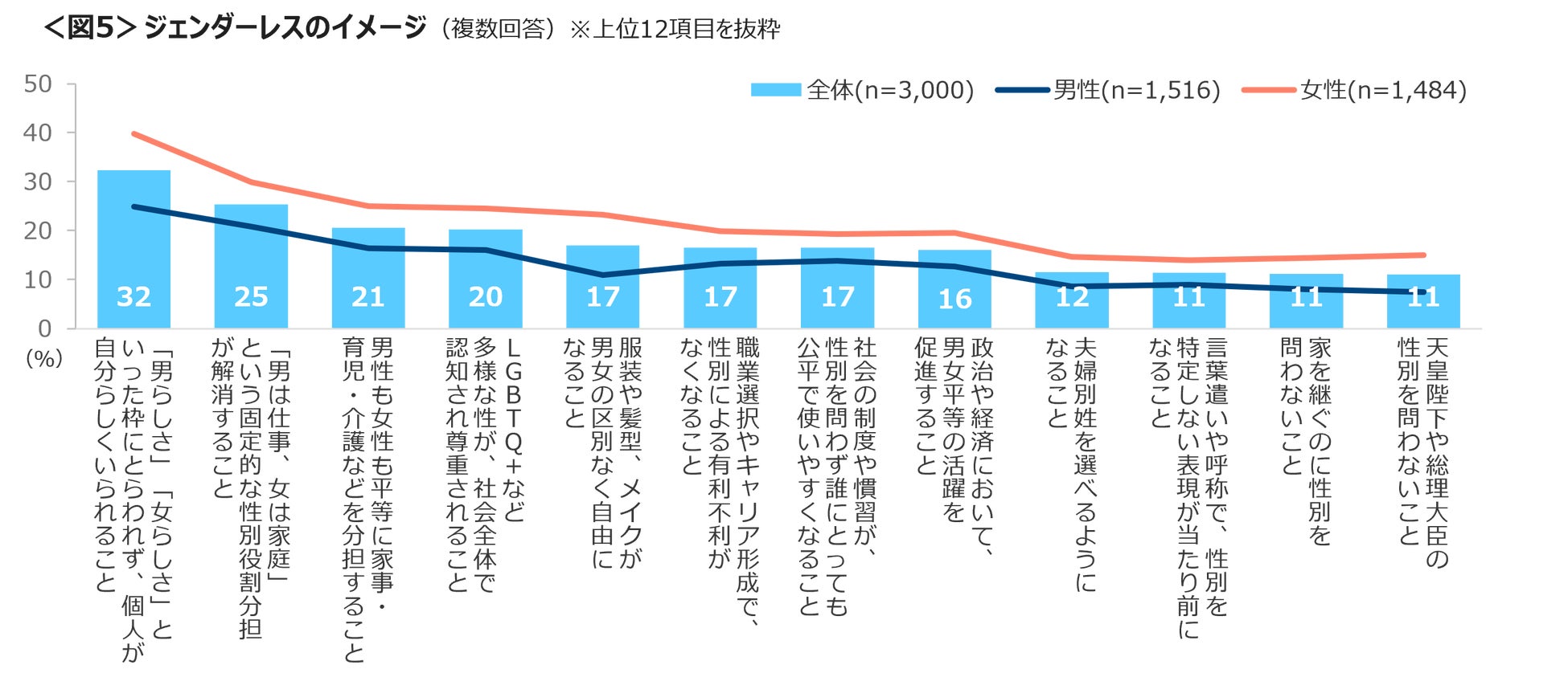 ジェンダーレスのイメージは「男らしさ、女らしさといった枠にとらわれず、個人が自分らしくいられること」が32%、「男は仕事、女は家庭という固定的な性別役割分担が解消すること」「男性も女性も平等に家事・育児・介護などを分担すること」「LGBTQ+など多様な性が、社会全体で認知され尊重されること」が20%台。上位の項目すべてにおいて、男性より女性の方が5~15pt強いイメージを持っている結果となった。<図5>