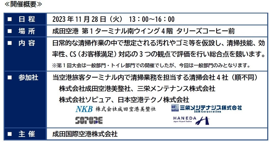 成田国際空港株式会社は、昨年11月の第1回大会に引き続き第2回となる「清掃スキルコンテスト」を開催いたします。海外からのお客様にとって日本の第一印象となる旅客ターミナルの美観を保つため、日々支えていただいている清掃スタッフのスキルを披露する場となります。今回は、来港されたお客様にご覧いただけるエリアで初めての開催となります。